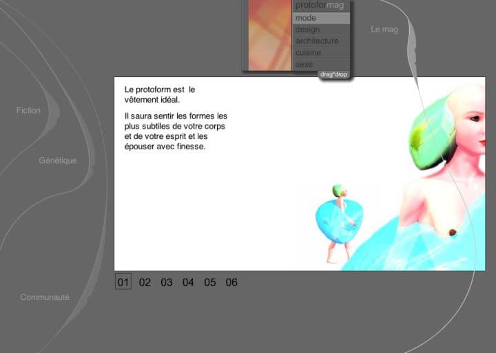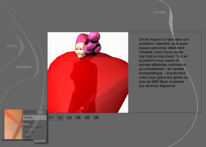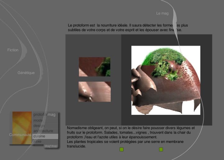 We built a website that presented this creature as if it already existed. A product catalogue for something impossible. Sections for fashion, architecture, cuisine, genetics, sexuality — each one exploring what life looks like when a single organism replaces every object you own. The tone was commercial, seductive, matter-of-fact. As if this were normal. The goal was to build the foundations of a persistent online world — a universe people could inhabit. It was my first attempt at worldbuilding.